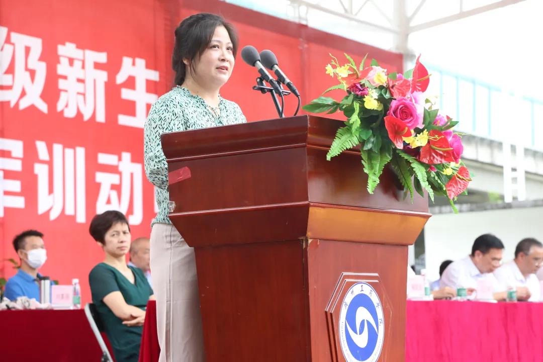 外语学院祝爱华副教授作为教师代表发言,她希望同学们努力做到内外徳学兼修,大学期间不断挑战自我,不忘初心,砥砺前行,不负韶华。