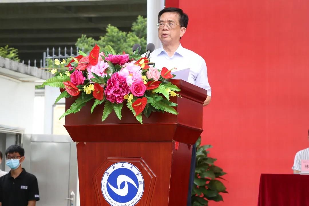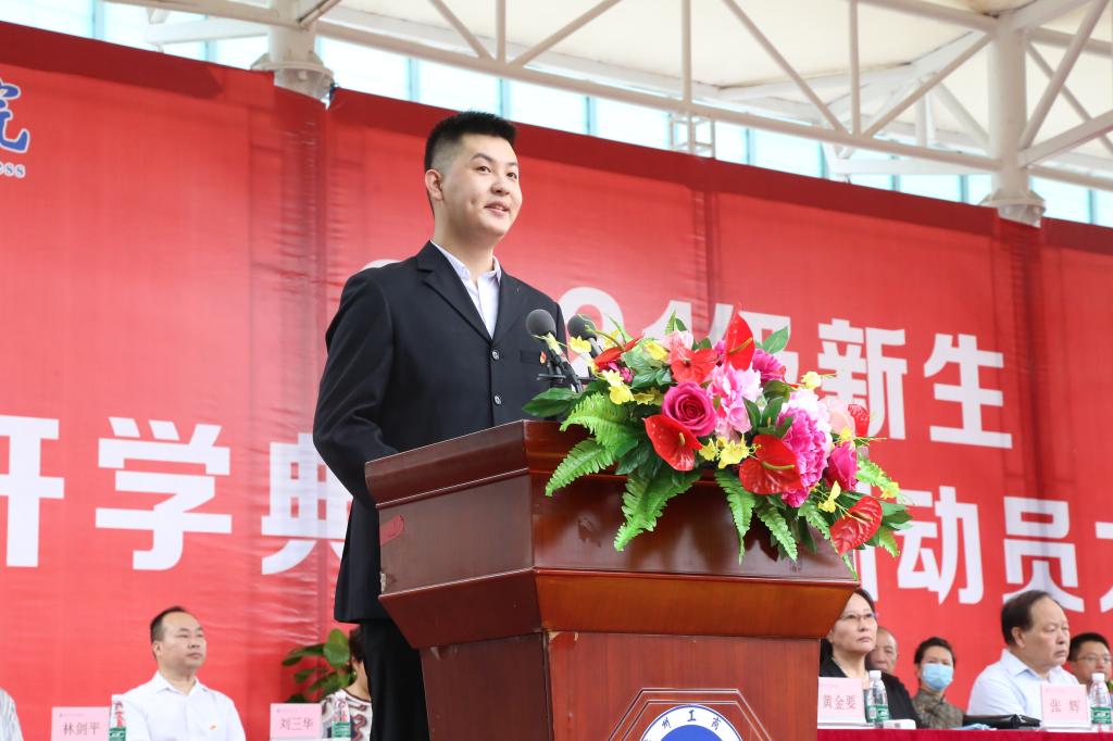 大会第三项——各学院老生、新生代表上台发言。外语学院王天逸作为老生代表发言,他向新生分享了学校的校园文化和自己的大学感悟,同时也预告了多姿多彩的广工商校园生活。他寄语师弟师妹们,要坚持“以德为行,以学为上”,首先要以学为先,而后要有健康的体魄和明确的目标,争做德学兼修的大学生。
