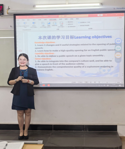 2025年5月22日下午,商务英语专业教研室举行刘婕老师示范公开课,刘婕老师带领23级商务英语专业B7班的同学们带来了一堂别开生面的《英语演讲与辩论》课。课堂上,同学们精神饱满、全员到齐,以积极的态度迎接这场知识的盛宴,商务英语教研室60余名教师参与本次观摩活动。