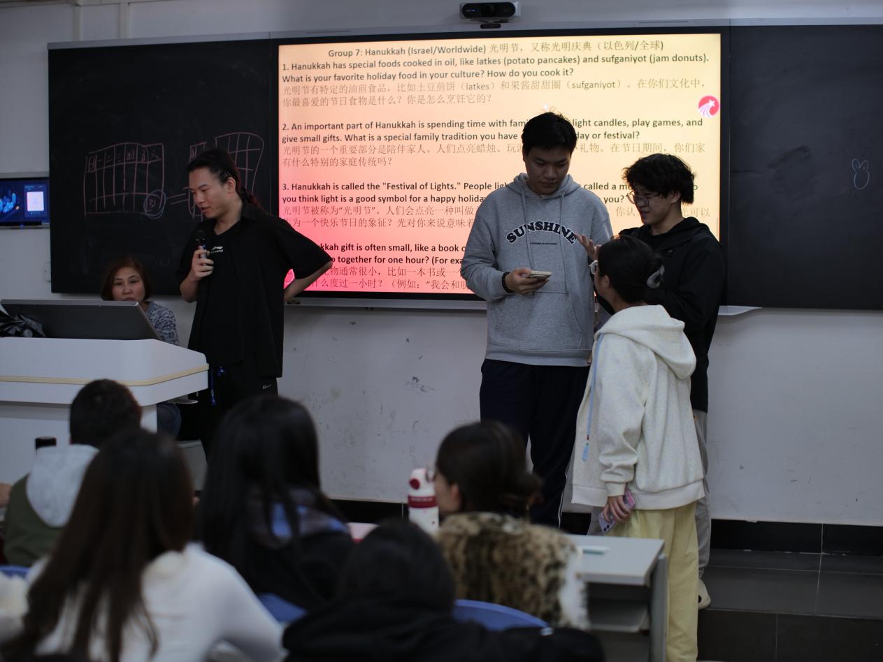 活动以趣味盎然的节日猜词游戏拉开序幕,同学们通过图像竞猜迅速融入节日主题。随后的小组讨论环节将现场推向高潮,八个小组分别围绕中国春节、狂欢节、水灯节等世界各地的特色节日展开深入交流。同学们用英语分享不同文化的节庆习俗、服饰特色和象征意义,在跨文化对话中拓宽视野,增进理解。