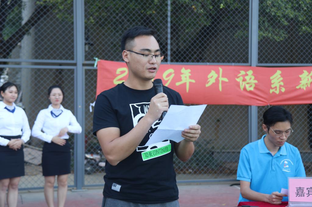 出席本次开幕式的嘉宾有外语系团总支学生会书记毕玉祥老师,外语系辅导员彭彩老师、孔方圆老师、汪玲老师、陈玲娟老师以及主席团成员。外语系团总支学生会书记毕玉祥老师为开幕式致辞,他希望运动员们坚持“友谊第一,比赛第二”的精神,赛出水平,赛出风格,同时为新生传达更快更年轻的中国精神的发言,希望运动员们展现自强不息的大学生青春风采。同时也感谢外语系团总支学生会主席李海铖师兄向运动员们致辞,希望保持对篮球的热爱,在比赛中赛出成绩。文娱部的精彩表演以及17级和18级的师兄们的篮球表演赛,为此次开幕式拉开了帷幕。