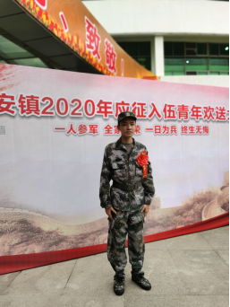 张嘉俊同学始终有一颗参军服役的恒心,参军是他从小到大的愿望,如今如愿参军,他非常开心,他说男儿志在四方,参军入伍,报效祖国,是他永远都不后悔的选择,参军路上,他会始终牢记“正德厚生,励志修能”校训,修德立身、志存高远,为父母争光,为母校争光,为祖国增光。