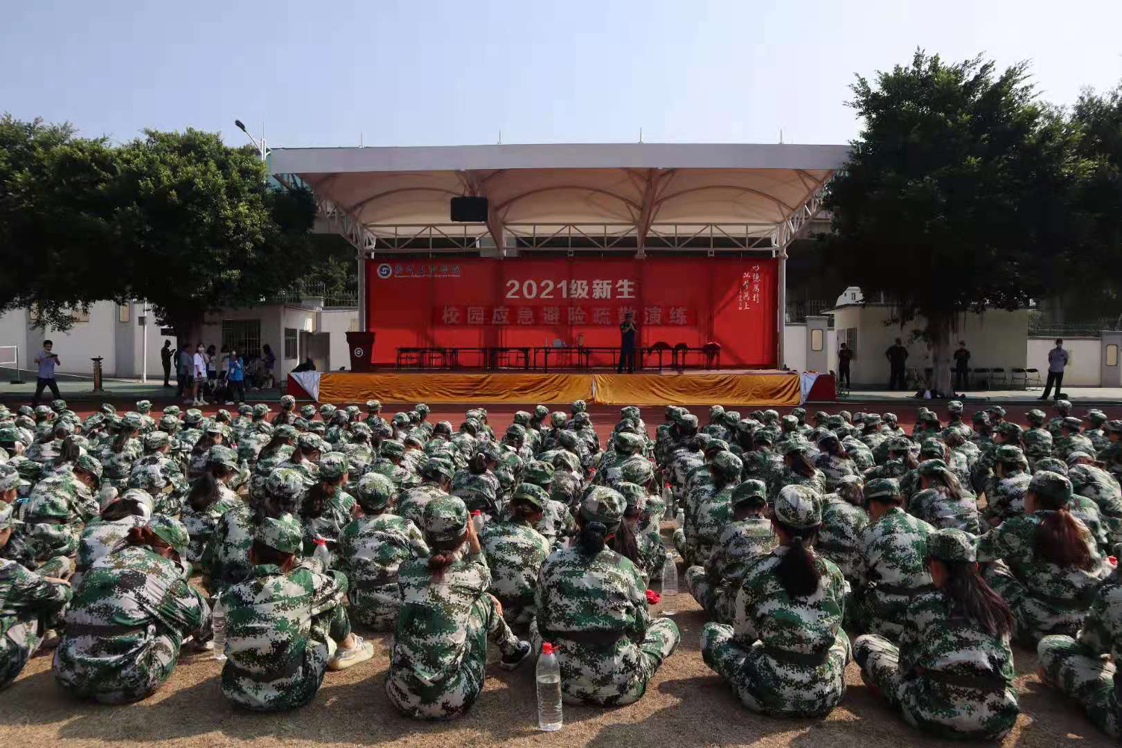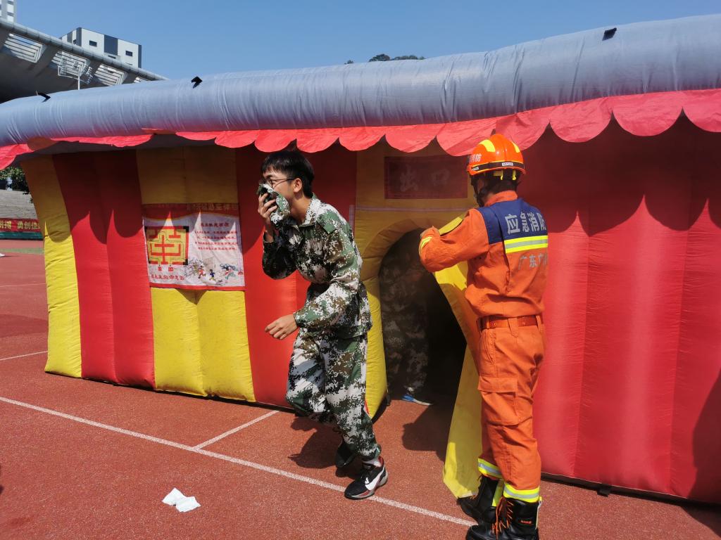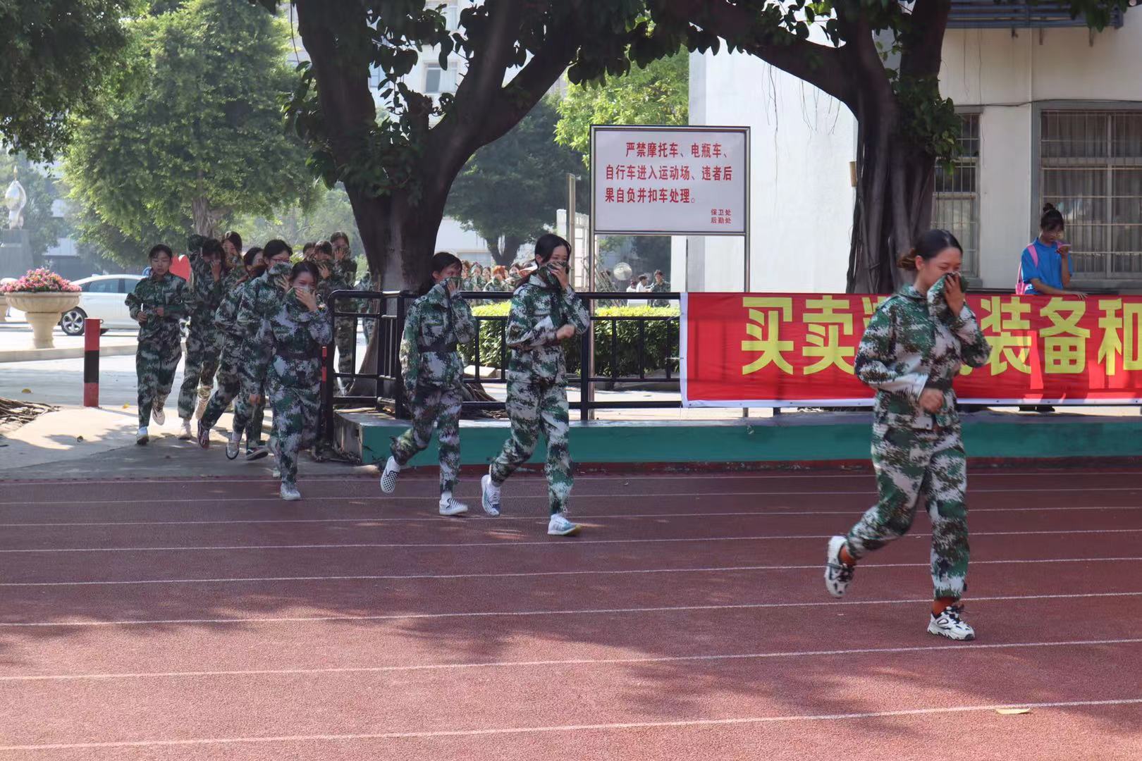 演练开始前,我院新生在田径场集合,各教官向新生们介绍了简单的逃生技巧与注意事项。随后,他们将新生分配至学生宿舍的不同区域以开展火灾逃生练习。当火灾警报拉响,我院新生迅速用随身物品掩住口鼻,俯身前往安全出口进行撤离。
