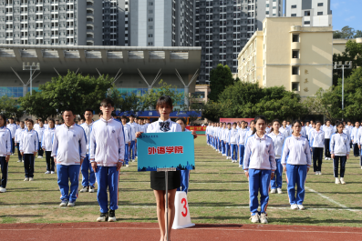 大会第三项,开幕式表演。各学院方队迈着铿锵有力的步伐,踏着响亮悦耳的节拍迎面走来。别样的风采,高昂的斗志,外语学院方队以青春的风采展示出他们的必胜决心;接着是我院学子参与的开幕式表演——健美操、功夫扇、体育舞蹈、广播体操等,每项表演无不展现出我院学子的青春活力与风采。