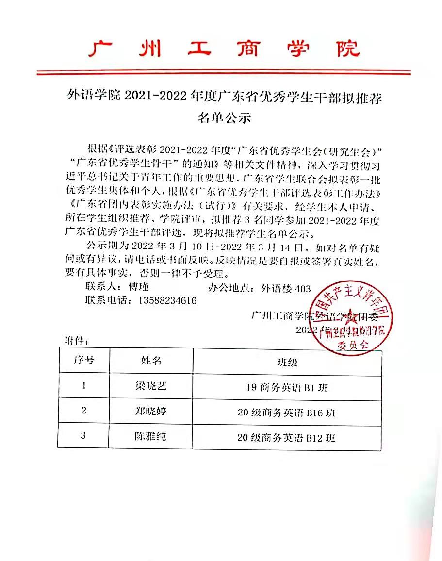 外语学院2021-2022年度广东省优秀学生干部拟推荐名单公示