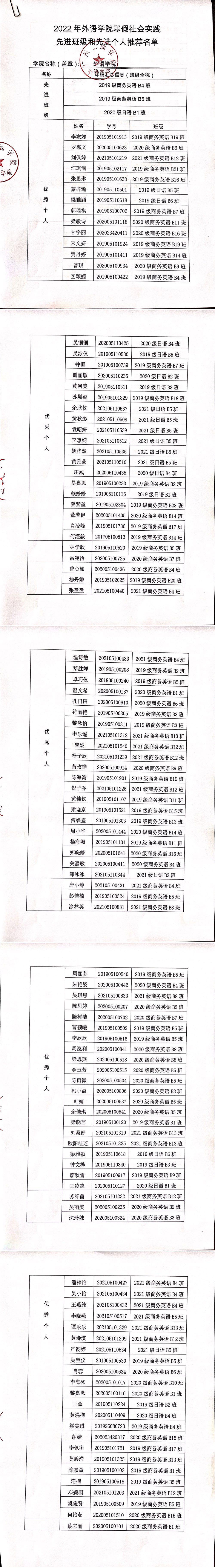 为深入学习贯彻习近平新时代中国特色社会主义思想和党的十九届六中全会精神,认真落实习近平总书记关于青年工作的重要思想,结合团中央关于全国大学生2022年寒假“返家乡”社会实践专项活动要求,根据《广工商校团发〔2022〕1号关于开展2022年寒假社会实践活动的通知》等相关文件的精神,经本人申请、指导老师推荐、辅导员推荐、学院审议,现将2022年外语学院寒假社会实践先进班级和先进个人推荐名单进行公示: