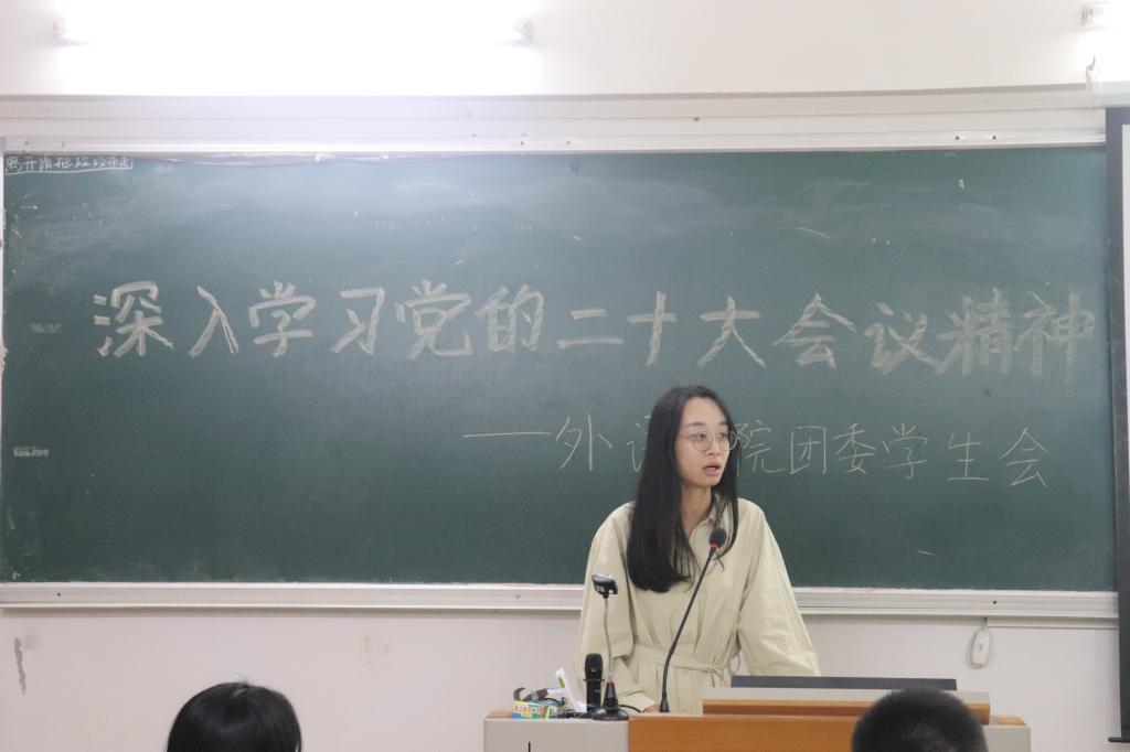 为进一步学习宣传党的二十大精神,切实推动党的二十大精神进课堂、进头脑,为我院团学指明发展方向,11月16日,ky开元集团官网外语学院在外语楼506教室召开“深入学习党的二十大精神”专题学习会,会议由外语学院团委书记傅瑾老师主讲,采用线上-线下相结合的方式开展,外语学院全体团委、学生会干部及工作人员参与了本次学习会。