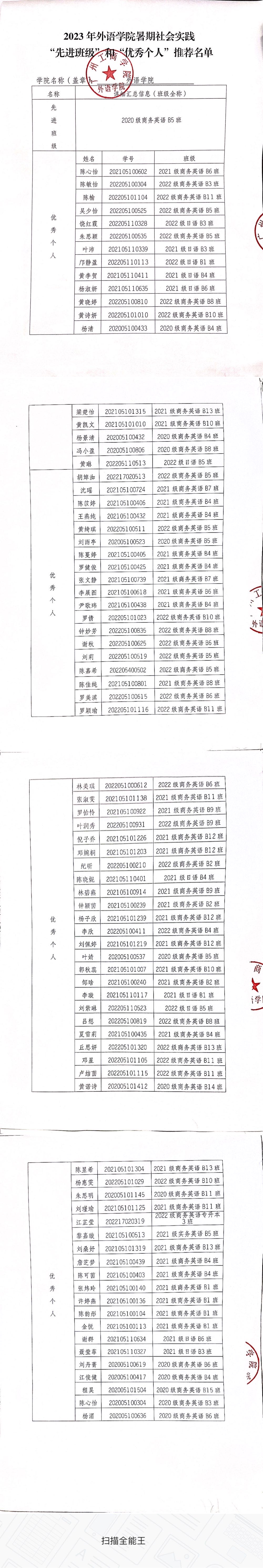 为深入学习习近平新时代中国特色社会主义思想和党的二十大精神,贯彻落实习近平总书记关于青年工作的重要思想,根据广工商校团发【2023】14号《关于开展2023年暑期实践活动的通知》文件精神,经个人申请、辅导员推荐、外语学院团委审核,按照参与该次实践活动的班级和学生人数3%的比例,结合我院评选标准,现将2023年外语学院暑假社会实践“先进班级”和“优秀个人”拟推优名单进行公示。