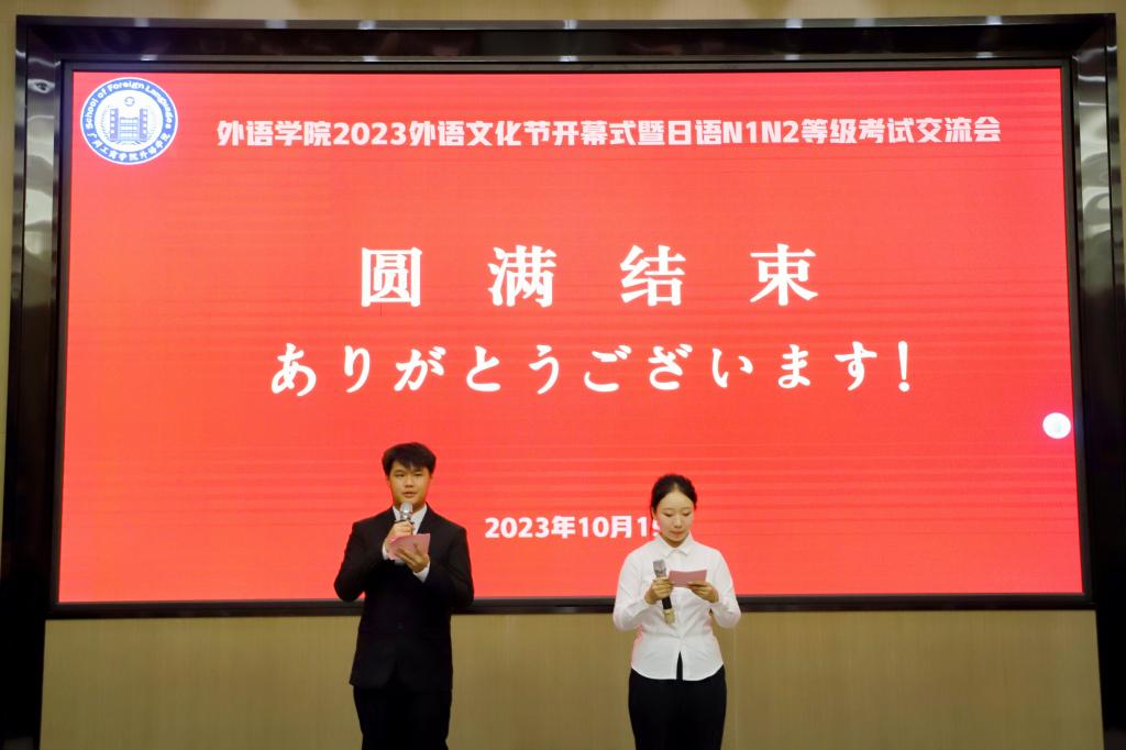 大会最后一项,主持人宣布外语学院2023年外语文化节暨日语N1N2等级考试交流会正式结束,预祝2023年外语文化节顺利开展!