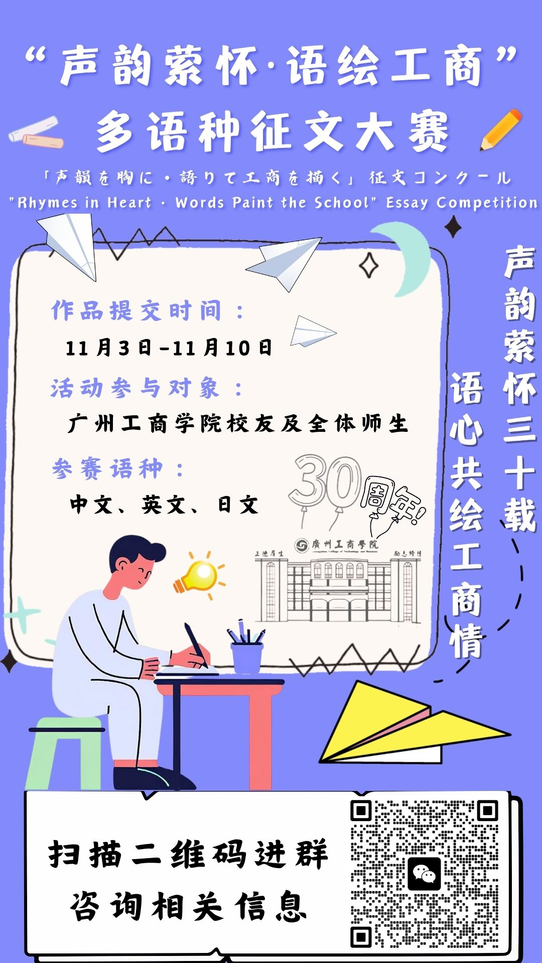 建校三十载,“以德为行,以学为上”深植工商沃土,“德学五进”滋养代代成长。为回望初心、传承校园精神、凝聚“工商人”情感,正值第十届外语文化节,外语学院特举办“声韵萦怀三十载,语心共绘工商情”多语种征文比赛——以笔墨溯校史、定格师生温情、借多语种抒情怀,在书写中聚归属感与凝聚力,为校庆注入文化力量!