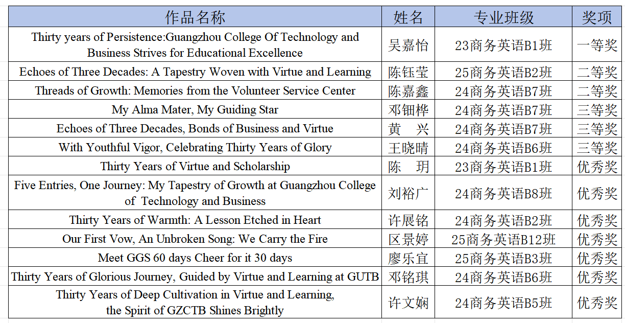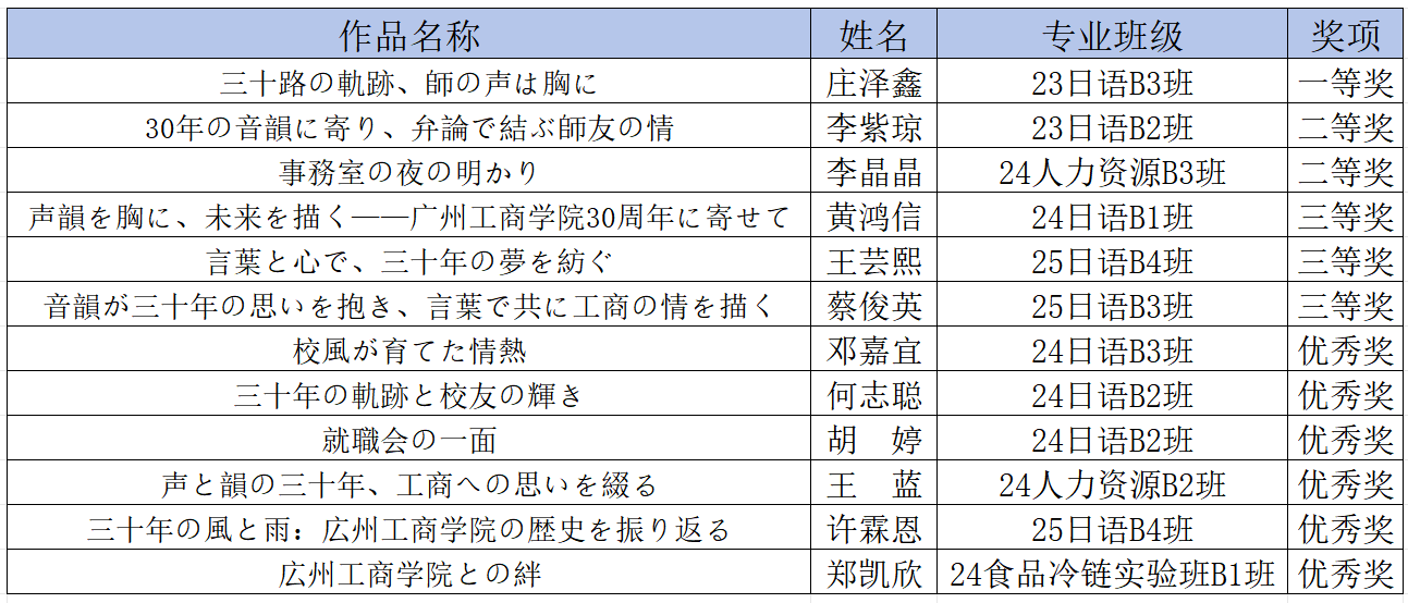 祝贺以上获奖同学!各位选手在比赛中以英、日、中三种语言为载体,书写工商三十载芳华,尽显语言素养与校园情怀,践行大赛“声韵萦怀三十载,语心共绘工商情”的主题,这份荣誉实至名归。衷心感谢全体参赛选手的积极参与,愿同学们持续以笔墨传情、以语言为桥,在跨文化表达中不断突破自我!