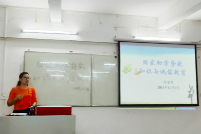 讲座主讲人特邀外语系学工组副组长何玉花老师担任。除感恩教育外,讲座亦涉及国家助学贷款知识及诚信教育。开场,老师通过自身经历,告诫同学们应重视“诚信”二字,莫在人生简历上留下不光彩的一笔,尤其是申请了国家助学贷款的同学,应清楚其中规则,及时进行还款。而本次讲座的重点是感恩教育。老师赠予同学们三句话:“怀感恩之心,回报一切关爱”、“让优秀成为一种习惯”及“把事情做到极致”。同时,她也对同学们寄予不要因为现在的情况把自己封闭,而是坦然地接受生活中的不美好,让不美好变成美好的希望。