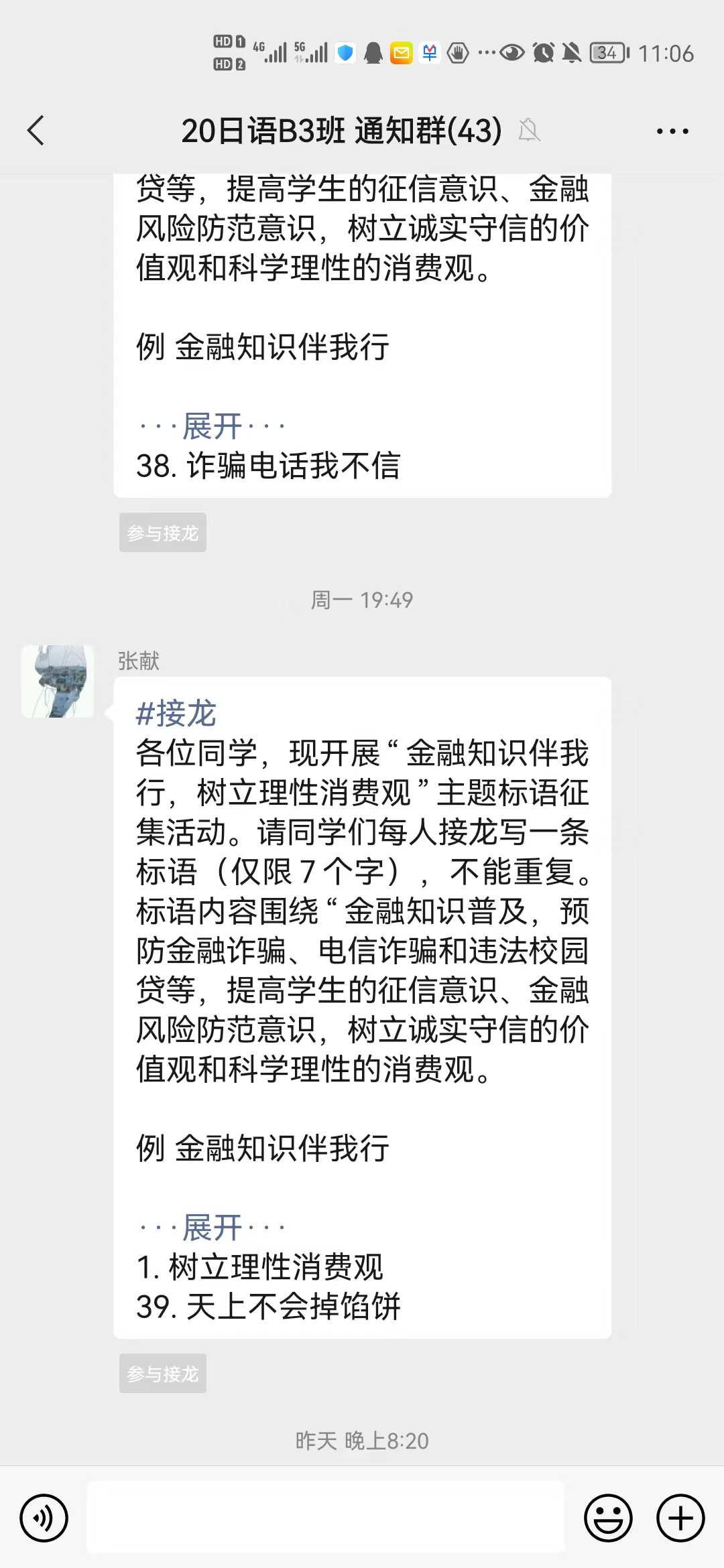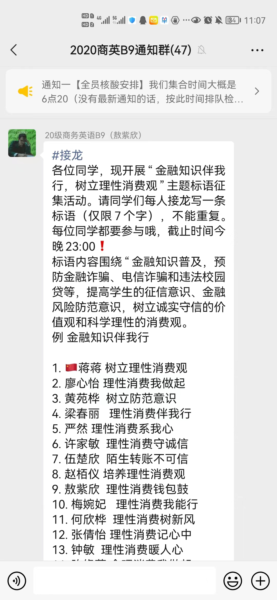 2022年5月30-31日,我院20商务英语B9-B12班、20日语B3班开展“金融知识伴我行,树立理性消费观”主题标语征集活动。本次得到同学们的积极参与,活动共计收集215条标语。
