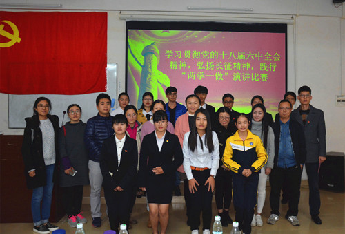 【本网讯】为纪念建党95周年和红军长征胜利80周年,全面深入推进“两学一做”学习教育,学习贯彻党的十八届六中全会精神,11月25日下午,以“弘扬长征精神,践行‘两学一做’”为主题的演讲比赛在花都校区经管楼111室顺利举办。学院党委组织部部长陈豫岚、党委办公室副主任奚少敏、外语系党总支书记周燕、工商管理系党总支副书记赵小峰、会计系党总支副书记苏建贤担任大赛评委。各基层党组织委员代表、师生党员、入党积极分子等代表观摩了本次大赛。本次演讲活动由学院党委主办,外语系党总支承办。此前,各学生党总支(支部)进行了精心的准备和选拔。