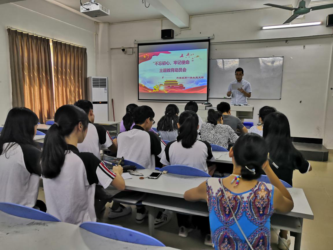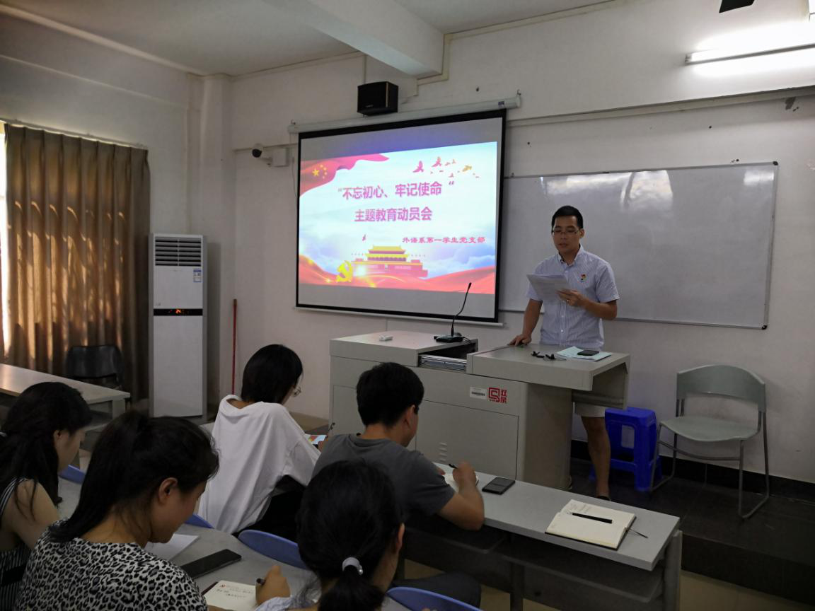 2019年9月19日,外语系学生第一党支部在外语楼302进行了“不忘初心、牢记使命”主题教育大会,会议由学生第一党支部书记苏伟豪老师主持,并就大会文件进行深入学习。
