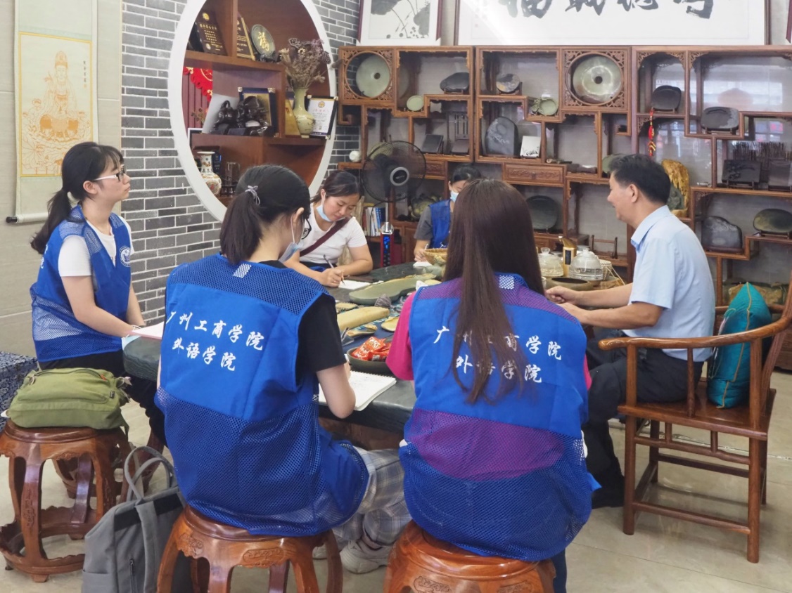 随后,实践小组来到调研活动的第二站,柳新祥端砚艺术馆。为了进一步了解端砚文化发展的现状,实践队伍参观柳老师的艺术馆并且与柳老师进行访谈。在交流过程中柳新祥大师讲述了其职业生涯、端砚历史与发展,对端砚的现状与市场状况发表了独特的个人见解;另外,柳新祥大师还提到推广端砚文化是自身作为国家级制砚艺术大师的使命担当。