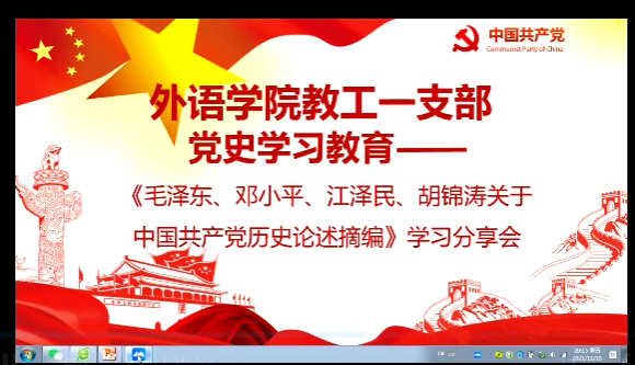 应党中央《关于在全党开展党史学习教育的通知》,11月19日晚上8点,外语学院教工第一党支部召开《毛泽东、邓小平、江泽民、胡锦涛关于中国共产党历史论述摘编》(以下简称《论述摘编》)学习分享会腾讯线上会议,会议由外语学院党总支副书记陈钧议主持。