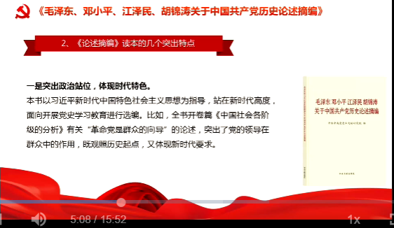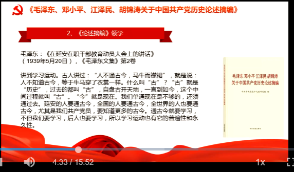 陈钧议同志简要介绍了《论述摘编》,领学了毛泽东同志1939年5月20日《在延安在职干部教育动员大会上的讲话》,也分享一些专家学者对《论述摘编》的特点。希望同志们在会后通过多种渠道进一步学习《论述摘编》内容,通过沟通交流不断提升对党史学习教育的认识。