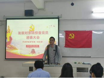 2021年11月19日中午,外语学院学生第一党支部发展对象转预备党员和预备党员转正通表大会于外语楼302课室成功召开,大会由支部书记苏伟豪老师主持,学生第一党支部正式党员、预备党员和发展对象参加了此次大会。