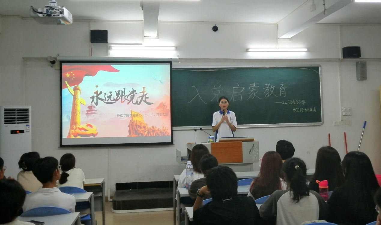 为加深外语学院2022级新生对党的认识,2022年9月28日晚8点30分,外语学院第一、二、三、四党支部在花都校区外语楼教室举办了2022级新生入党教育大会。