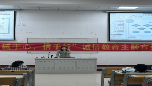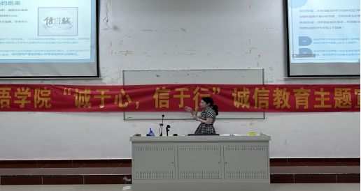 首先,第一个出场的是冯巧娟老师,冯老师主要讲解了诚实守信的重要性。诚信是中华民族的传统美德,是社会主义核心价值观的重要内容,更是大学生立身为人,成长成才的必备品质。冯老师呼吁诸位毕业生以诚立身,在今后的工作生活中诚开金石,信步天下。