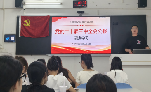 为了深入学习贯彻中国共产党第二十届中央委员会第三次全体会议精神,外语学院学生第三党支部积极响应,于2024年9月26日外语楼306课室召开专题学习会,集中学习《中国共产党第二十届中央委员会第三次全体会议公报》文件,领学人为毕玉祥书记。