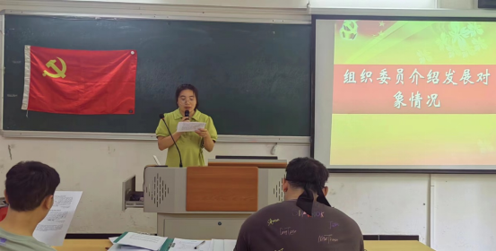 会议开始前,全体起立奏唱国歌。接着,外语学院学生第四党支部组织委员覃青霞同志向同志们介绍发展对象曾明珠、周小华、郑晓婷的情况。