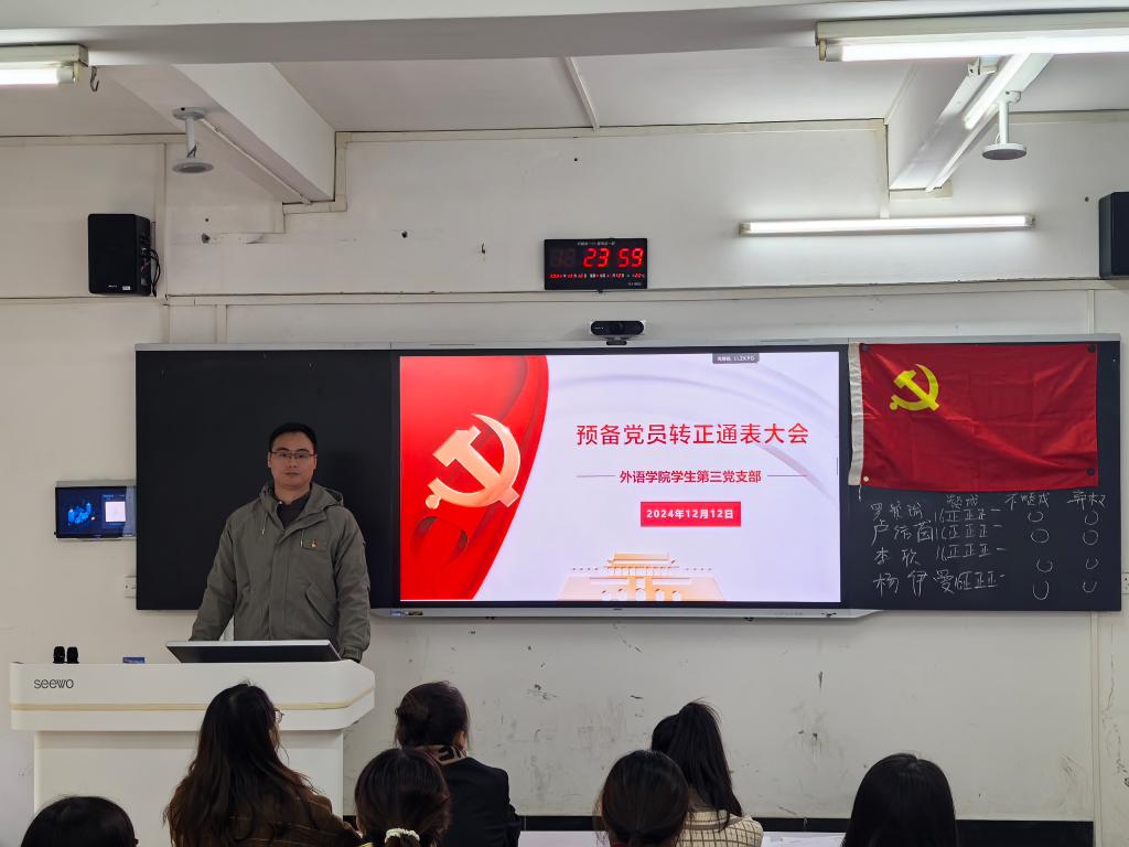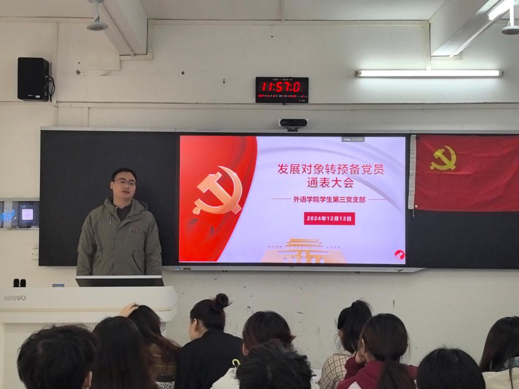 2024年12月12日,外语学院学生第三支部在外语楼302课室召开发展对象转预备党员暨预备党员转正通表大会。此次大会旨在审议并表决发展对象转为预备党员以及预备党员转为正式党员的议题,进一步壮大和优化党员队伍,为党组织注入新的活力和动力。本次会议由支部毕玉祥同志主持,何玉花、傅瑾等党员同志及支部发展对象参加了会议。