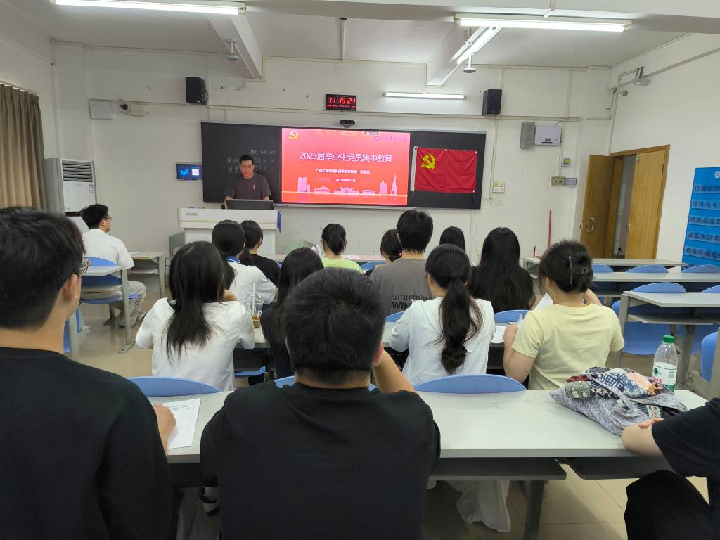 2025年6月22日上午11:00,外语学院学生第一党支部召开了毕业生党员教育大会,本次会议由支部书记苏伟豪主持,支部党员参加会议。本次会议旨在强化毕业生党员的理想信念与责任担当,引导其深刻领悟党员身份的使命内涵,将党的理论知识转化为投身社会建设的实践动力,帮助毕业生党员在人生新征程中坚守初心、勇担使命,以先锋模范姿态在各自岗位上发光发热,为社会发展与民族复兴贡献力量。