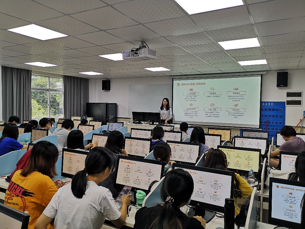 课堂上,她首先分析了目前大学生的就业形势,并建议同学们树立正确的就业观;其次从企业的角度讲讲就业的有关准备;最后,结合自己的企业经历告诉同学们一些实用的面试技巧。