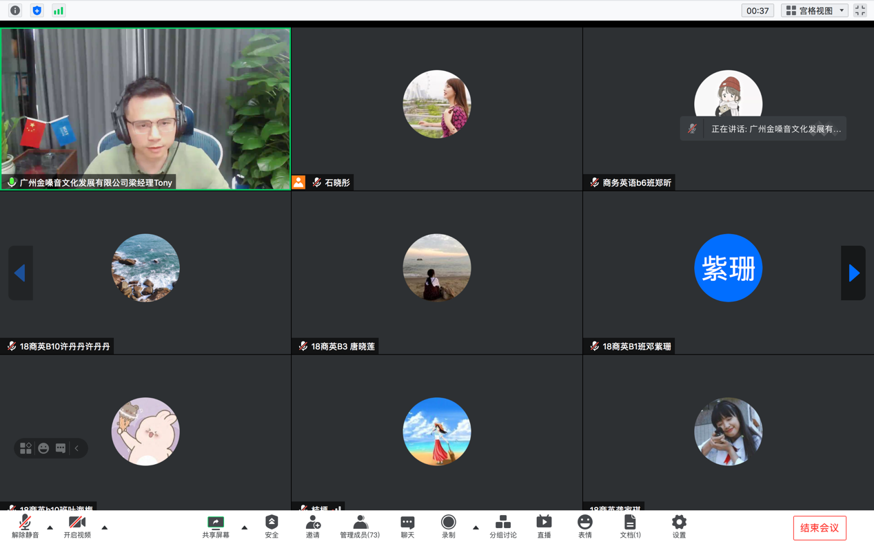 2020年6月30日中午,广州金嗓音文化发展有限公司的人力资源总监梁明通经理通过线上会议的模式,为外语学院17级商务英语专业的学生做了“企业家进校园”宣讲会,主要分享了该公司的基本情况、人才需求、校企合作概况、实习生就业情况以及对现今就业形势的分析解读。