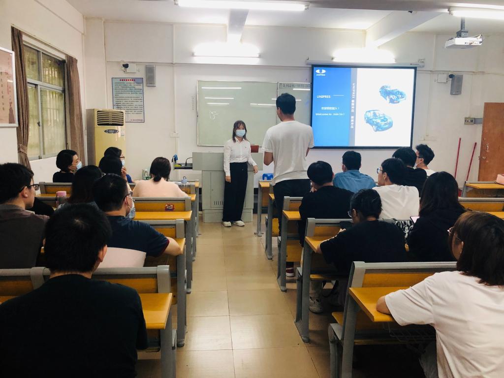 广州优尼精密有限公司(日本独资),成立于2009年11月,位于广州市花都区花港大道77号。主要生产汽车变速箱关键零部件。公司发展机制健全,薪酬体系合理。本次主要是面向18级毕业生招聘行政管理实习生。会上同学们积极与公司人员互动,就自己关心的问题进行提问。
