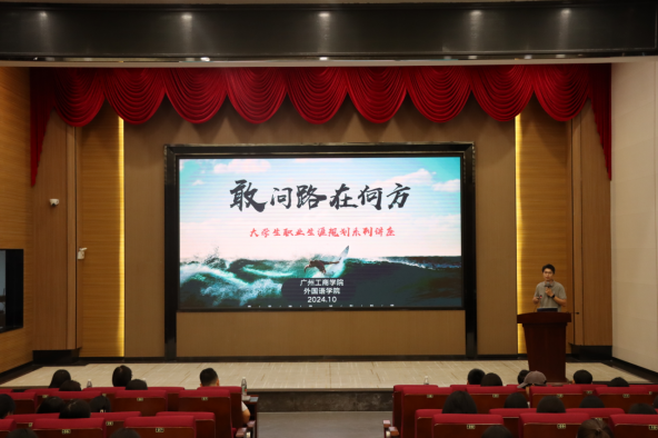 2024年10月10日,广州市支点公考教育咨询有限公司总经理王建兵先生应邀来到ky开元集团官网,为外语学院学生带来了一场主题为“敢问路在何方——大学生职业生涯规划”的精彩讲座。此次活动吸引了两百多名学生参加,大家齐聚一堂,共同探讨职业发展的方向与策略。