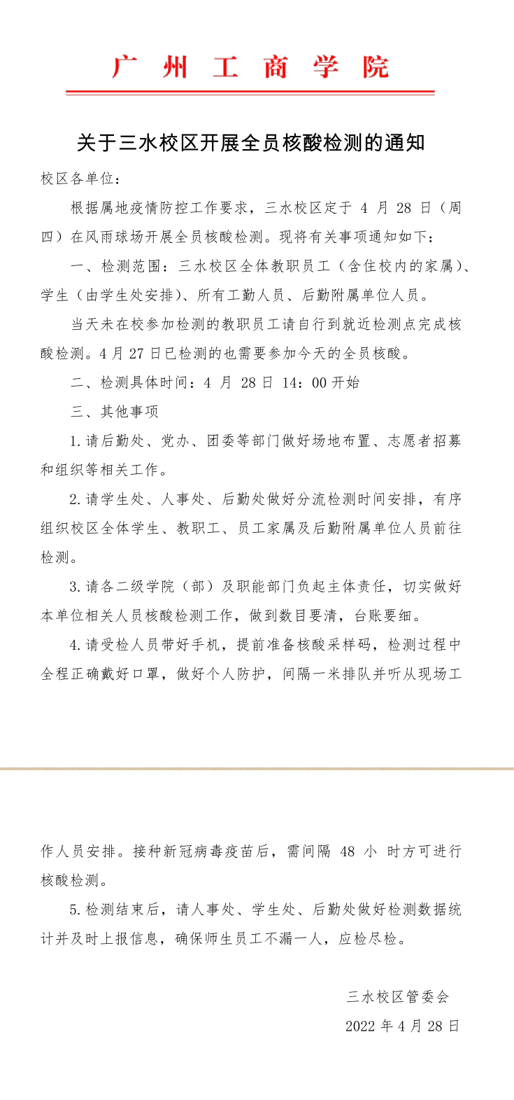关于三水校区师生员工开展核酸抽测的通知