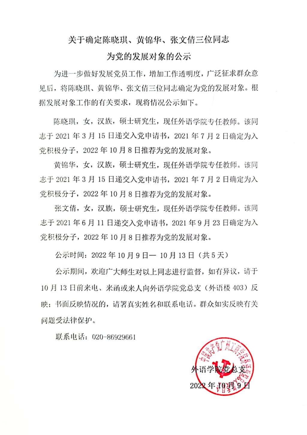关于确定陈晓琪、 黄锦华、 张文倩三位同志为党的发展对象的公示