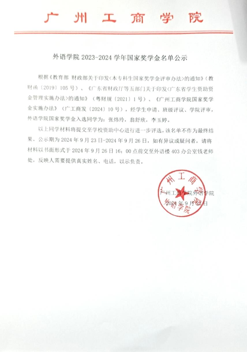 关于外语学院2023-2024学年国家励志奖学金增补名单的公示