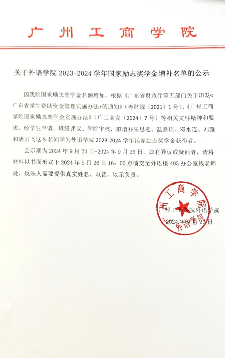 关于外语学院2023-2024学年国家励志奖学金增补名单的公示