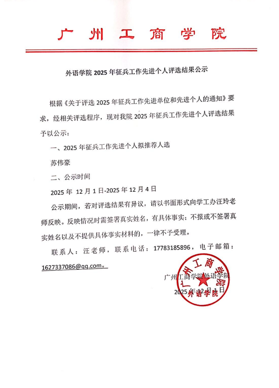 外语学院2025年征兵工作先进个人评选结果公示