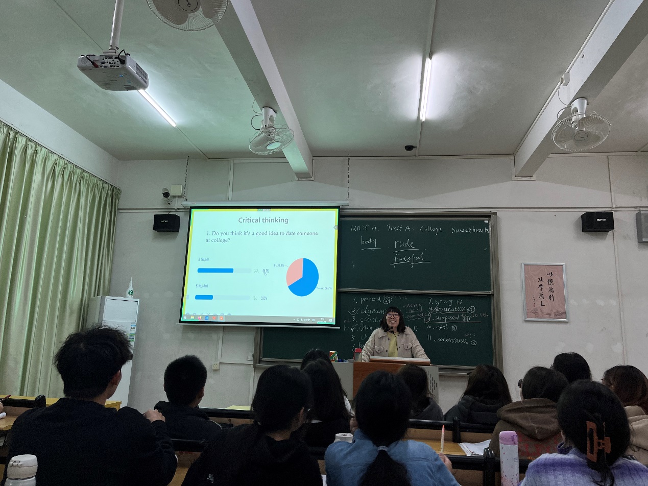 本次教学观摩课主讲教师是大学英语教研室的郭奉红老师,内容是《新视野大学英语读写教程(思政智慧版)》第二册第4单元“College Sweethearts”。在教学中,郭老师抓住语言输入、输出两个关键点,巧妙衔接各教学环节,突出学生参与、师生互动,兼顾拓宽学生文化视野、提升学生的人文素养、充分体现大学英语教学的“全人教育”、“思政育人”的教学理念。