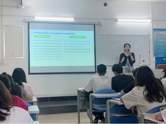 本次教学观摩课主讲教师是外语学院大学英语教研室的张丹老师,内容是《新视野大学英语读写教程(思政智慧版)》第二册第5单元“Money Game”中的对比类作文部分。张老师以一则有趣的视频导入主题,采用问答、讨论等多种教学方法,引导学生分析示例段落,总结出对比类作文的写作目的及主要组成因素。再者,张老师通过层级式教学设计,环环相扣,突出“point by point”和“ subject by subject”两种写作格式的结构特点及优势,使学生明晰上述两种写作格式所涵盖的大纲内容。最后,张老师强调撰写对比类作文时,要注意对比事物间的“公平性”,即文中涉及的比较标准要前后一致,而不能主观性地倾斜于某一方,讲解清晰到位。
