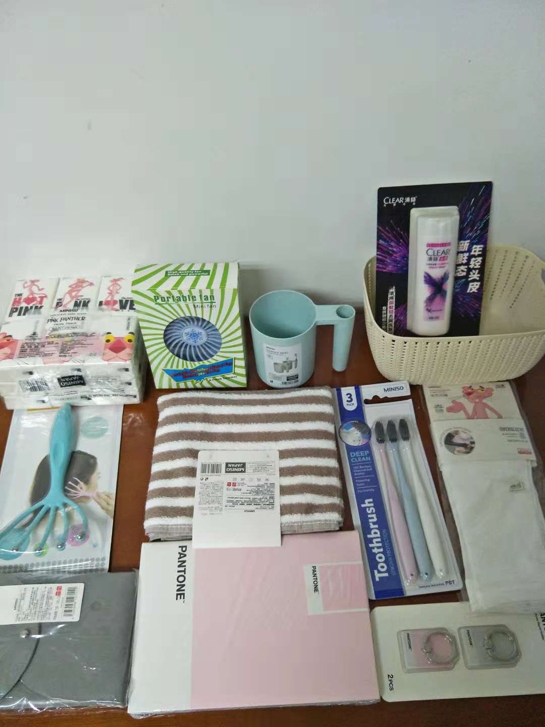 1.生活类:手提包、按摩器、针线包、三支装牙刷、清扬洗发水等