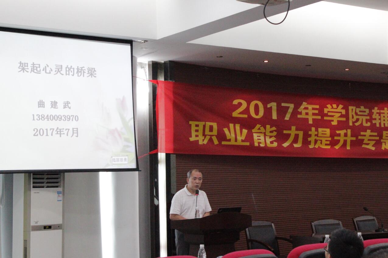 曲教授首先讲述他“弃官从教”的缘由,即放弃担任“辽宁省高校工委副书记、省教育厅副厅长、正厅级巡视员”,转为从事普普通通的一线辅导员。他之所以从这么“重量级”、许多人“虎视眈眈”的职务“跳槽”到不少人“嗤之以鼻”的辅导员职务,用他的话回答是,“我对学生的爱”。在场的辅导员们为之感到惊讶、赞叹与钦佩。接着,他以讲故事的方式分享与学生相处的各种苦与乐、悲与欢。从他朴实的话语中透漏出,一个老辅导员对学生的无限关爱、对教育事业的炽爱情怀、对国家民族的赤子之心。他总结到,“工作要做得细致一点,再细致一点,要保持简单的心态,学会付出,辅导员也可以不平凡,做辅导员也能做出了不起的成就。”