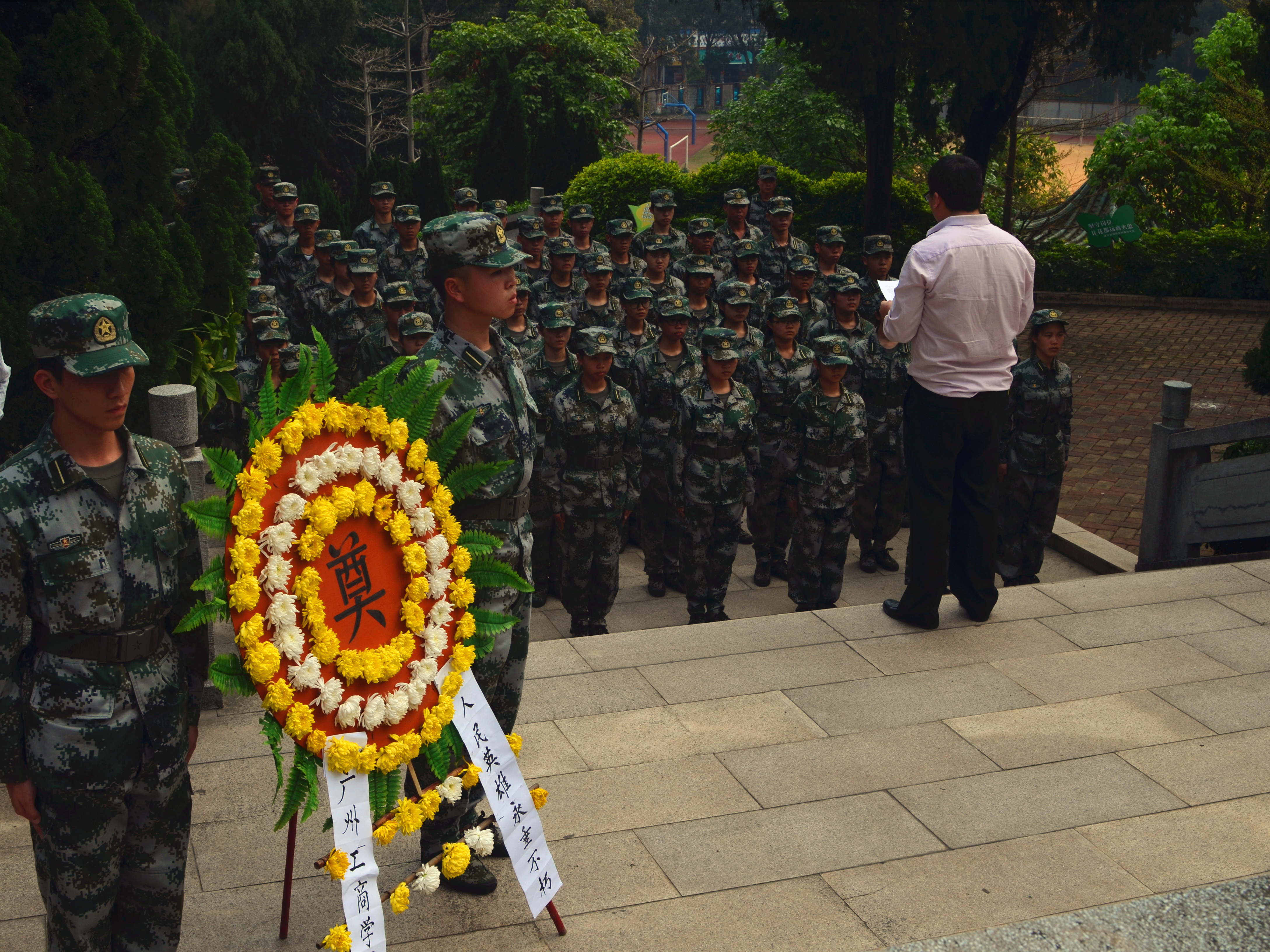 烈士陵园里,松柏长青,气氛庄严。在学生党总支各位老师的带领下,全体队员迈着整齐地步伐,在纪念碑前肃立、敬礼。然后,由督察队队员代表向革命烈士敬献花圈,以表示对革命先烈无限的敬仰和崇高的敬意。全场默哀一分钟,静默地缅怀着为国捐躯的先烈们。