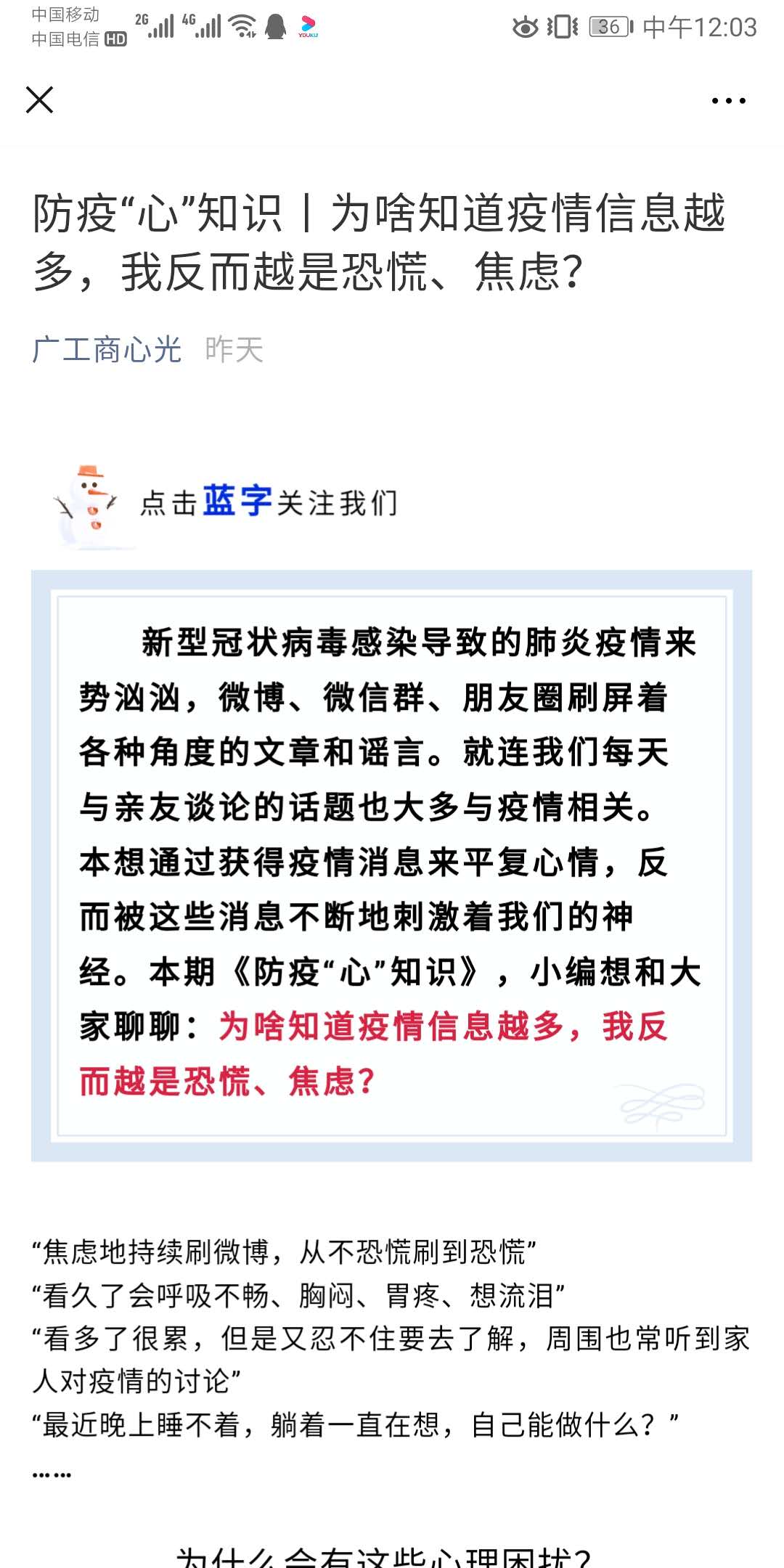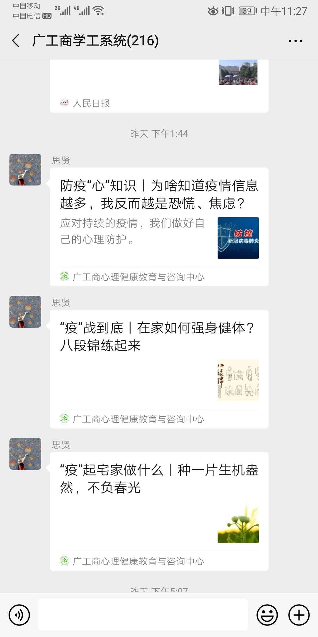 防疫心理疏导。心理咨询中心于2月1日开通抗疫期间网络心理支持服务,全力做好抗疫期间相关的维稳工作和危机事件的心理预警、预防和干预工作,开设线上心理支持服务,及时排解心理困惑,为全校师生的心理健康护航。关注重点对象,主动关心服务做好心理调适,推介心理支持服务资源。通过“广工商心光”公众号开设《防疫“心”知识》、《“疫”战到底》和《“疫”起宅家做什么》等栏目,定期发布抗疫期间心理保健知识和防疫保健知识,引导学生用最强信念、最佳气势、最好状态迎战“疫”情,以构筑坚固的安全堡垒。