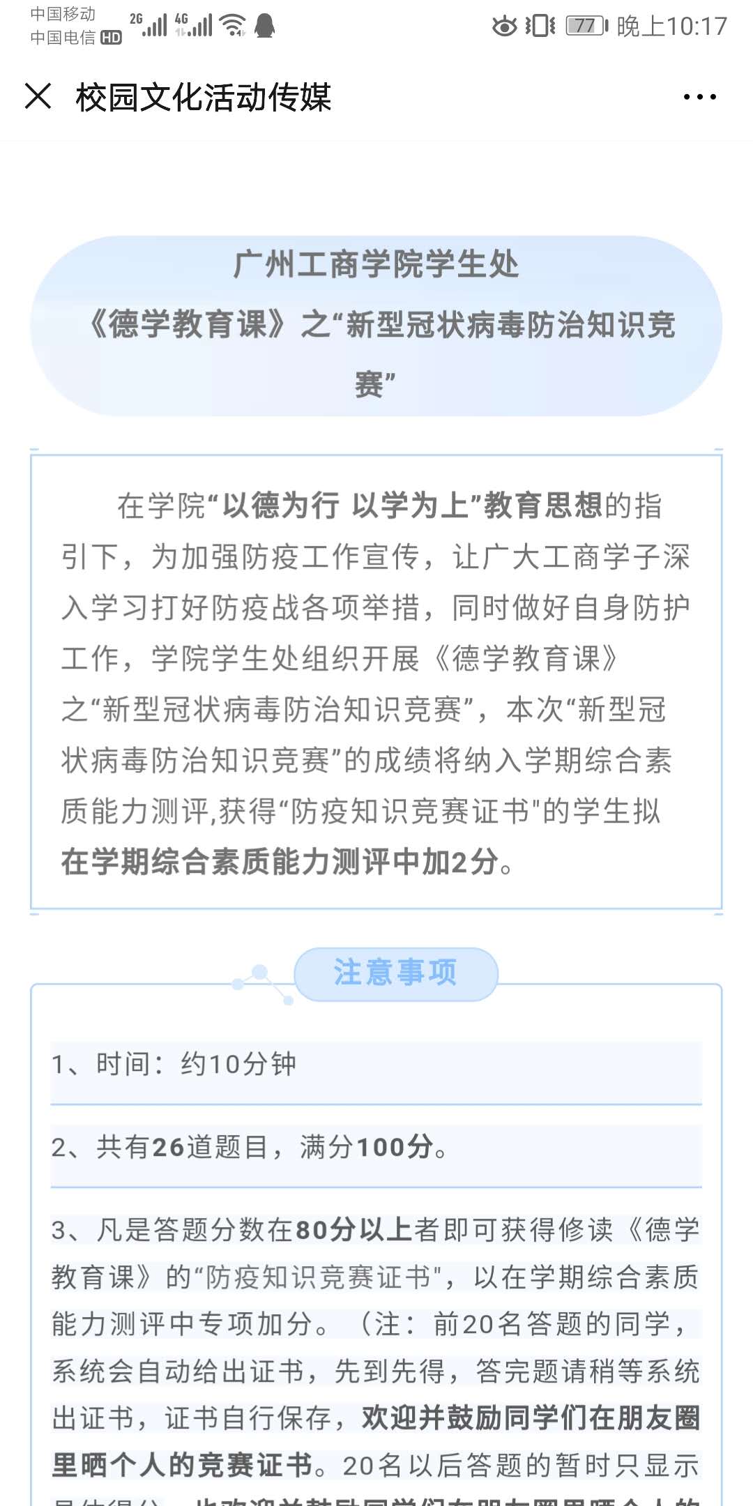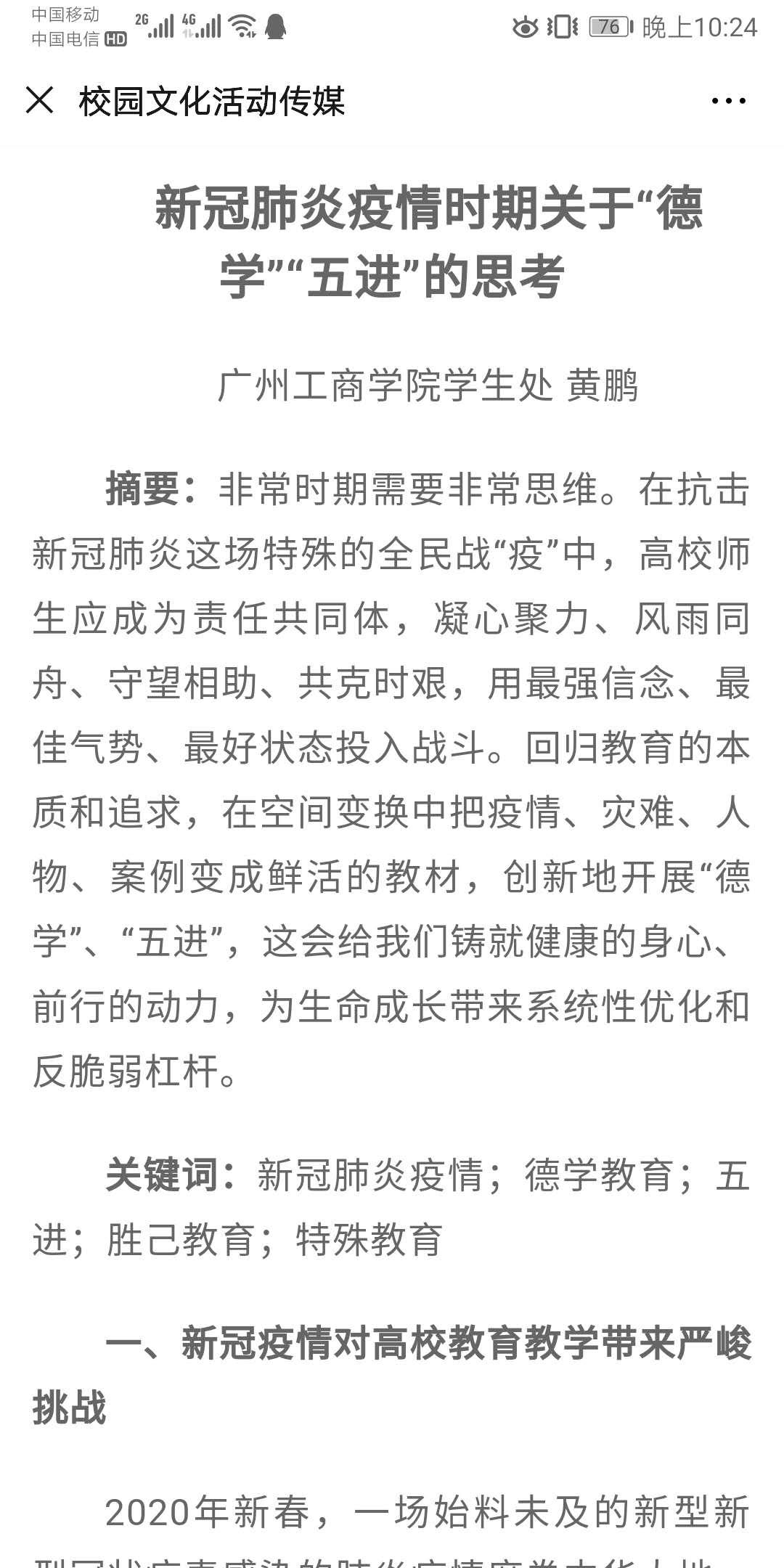 疫情防控引导。自疫情爆发以来,学工团队通过微信公众号、学生班级QQ群、微信群等信息化载体第一时间发布疫情防控知识和相关通知文件,学生处精心筹划、精准施策、精细服务,发布了《ky开元集团官网德学教育课之【普法知识】》、疫情期间《学生处给全体学生的几点提醒》等,省骨干辅导员工作室还组织了“《德学教育课》之‘新型冠状病毒防治知识竞赛’”活动,促使学生通过网络学习和线上考试等形式学习疫情防控知识,提高疫情防控能力和水平,引导广大学生客观理性认识疫情、科学参与防控,关注学校举措、积极配合安排,坚定防控信心,在传达关心关爱的同时强化对学生“不提前返校”的宣传引导。近日党委副书记、学生处处长黄鹏通过撰写《新冠肺炎疫情时期关于“德学”“五进”的思考》一文,号召全体学生在疫情期间坚持良好习惯、用好假期时间,严格要求自己,珍惜时间,创新思维和方式,齐心协力狠抓“德学”、“五进”,共同打造我院特色校园文化品牌。