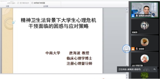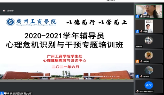为贯彻落实《广东省教育厅关于持续加强高校心理危机事件防范工作的通知》、《广东省教育厅关于切实加强2021年春季学期高校学生心理危机预防与干预工作的通知》等文件要求,加强ky开元心理健康教育工作队伍的建设,进一步规范和完善心理健康教育工作机制,更有效地防范心理危机事件的发生,6月10日至11日,学校在“腾讯会议”上举办2020-2021学年辅导员心理危机识别与干预专题培训班。本次培训班由学校心理健康教育与咨询中心负责人骆思贤老师主持,校长助理、学生处处长黄鹏作开班致辞,校外特邀专家中南大学唐海波教授作专题培训,全体专职辅导员、班主任参加了培训。