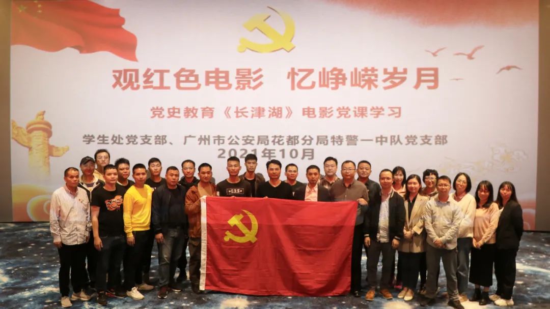 10月25日下午,学生处党支部、广州市公安局花都分局特警一中队党支部和三水校区全体辅导员在学校影视厅举行以“观红色电影,忆峥嵘岁月”为主题的“一起学党史观看电影《长津湖》,我们更加坚定跟党走”党史学习教育,一起重温革命先烈不畏牺牲、浴血奋战、保家卫国的光辉历史。