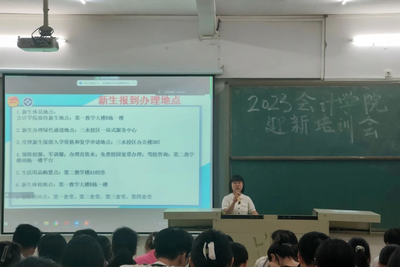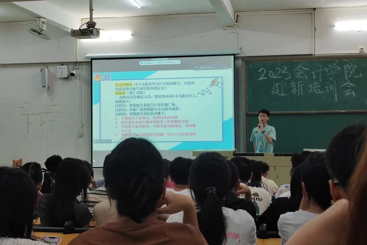 为了更好地迎接新生的到来,确保本届迎新工作的高效完成,会计学院于9月9日晚在一教C102开展迎新培训会。本次会议由会计学院团委书记张圣荧老师,会计学院团委学生会21级、22级干部以及学生志愿者参与组织,此次培训会由主席团邓元锋同学主持,采取线上线下的方式进行。