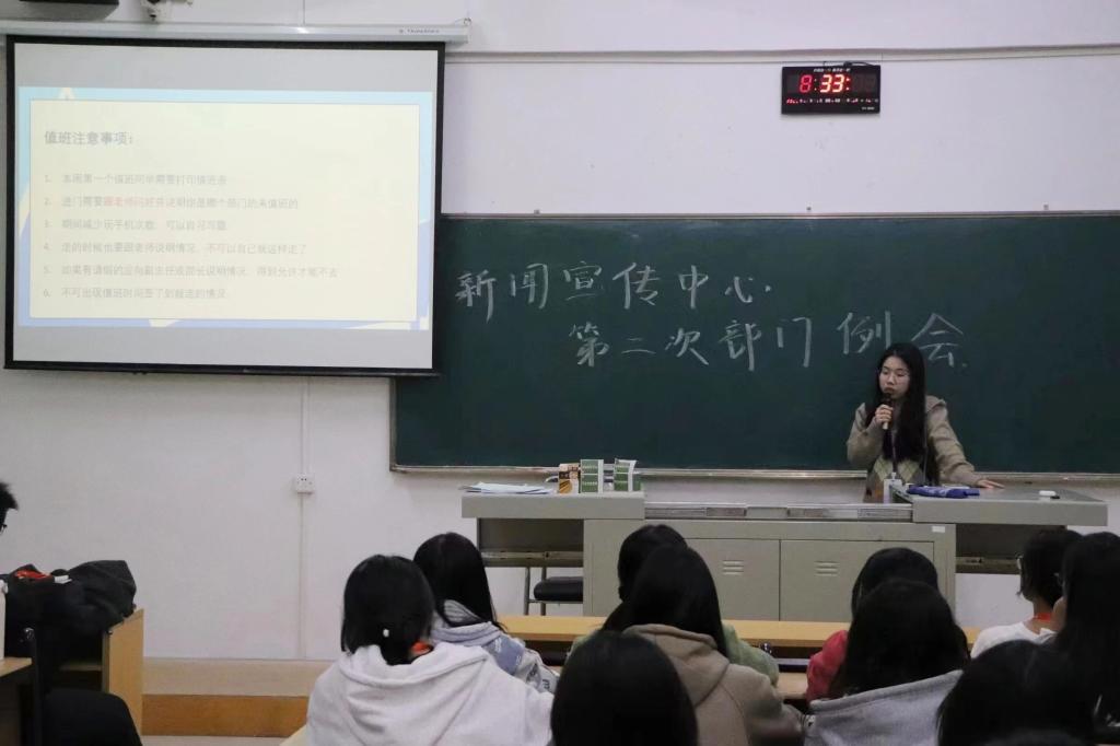 岁月不居,转眼间新干事加入新闻宣传中心这个大家庭已有一段时间了。副主任林舒婷同学总结了部门干事在近段时间值班时存在的问题,并再次强调了部门的规章制度。