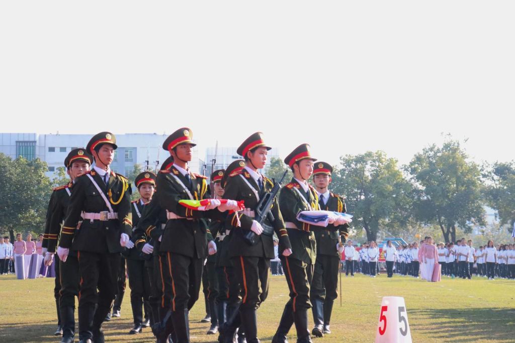 热血满腔洒,筑起凌云志;挺胸迈阔步,灼灼耀其华。国旗护卫队手举耀眼夺目的五星红旗,踏着铿锵有力的步伐向前迈进。